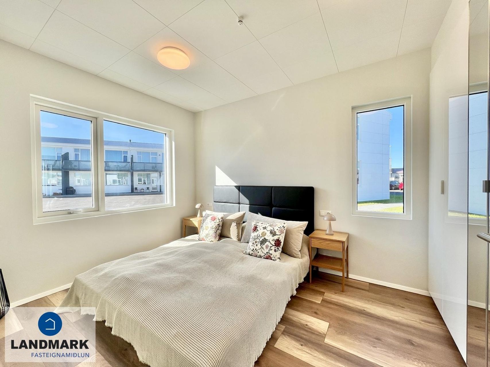 Eignin skiptist í forstofu, tvö svefnherbergi, eldhús, stofu, baðherbergi, þvottahús og bílskúr. Sér hellulagður afnotareitur er út frá stofu og sömuleiðis er innkeyrsla steypt og hellulögð með snjóbræðslu. Rafhleðslustöð er til staðar og fylgir.