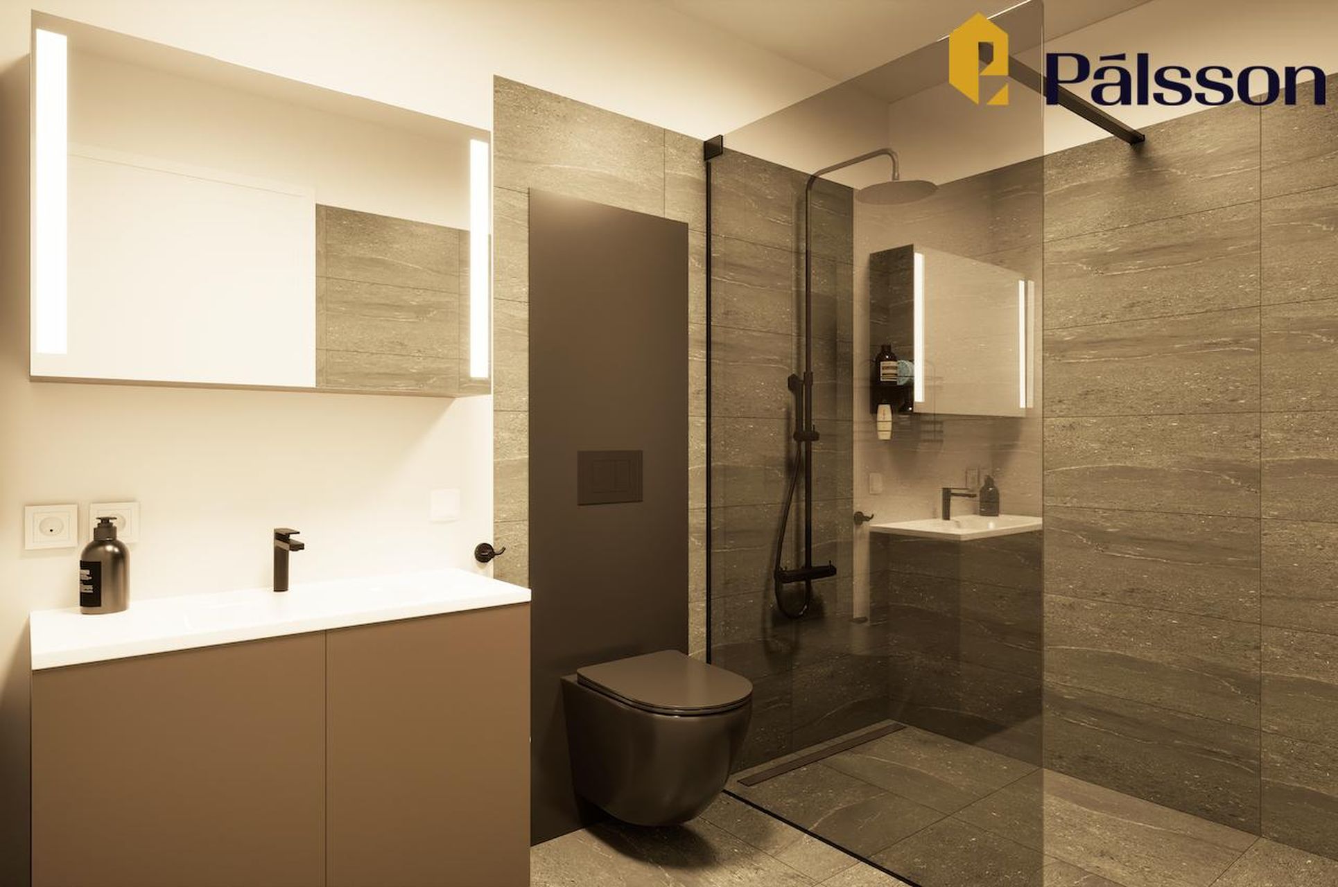 Baðherbergi með “walk-in” sturtu með hertu gleri, handklæðaofni og upphengdu salerni. Gráar steinflísar á gólfi og veggjum, Taupe grá innrétting og speglaskápur með lýsingu. Blöndunartæki á baði úr byssubláu stáli. Afmörkuð aðstaða á baði fyrir þvottavél og þurrkara.