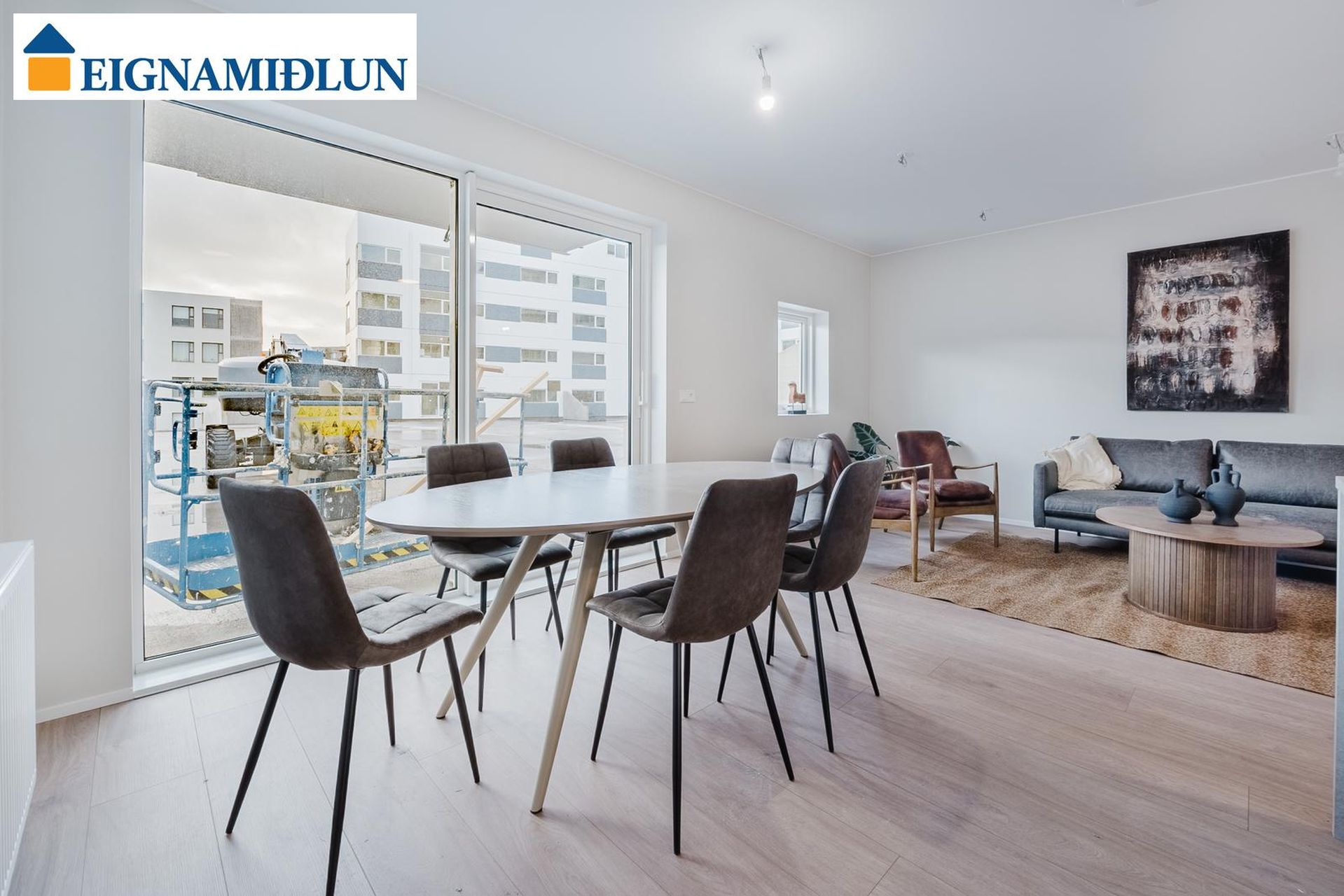 Íbúð merkt 208 - 4ra herbergja 126,3 fm íbúð á annari hæð með þrem svefnherbergjum, sér þvottahúsi og rúmgóðum svölum. Rúmgott svefnherbergi og tvö minni barnaherbergi, baðherbergi, opið eldhús inn í borðstofu og stofu með eyju í eldhúsi. Bílastæði í bílakjallara.