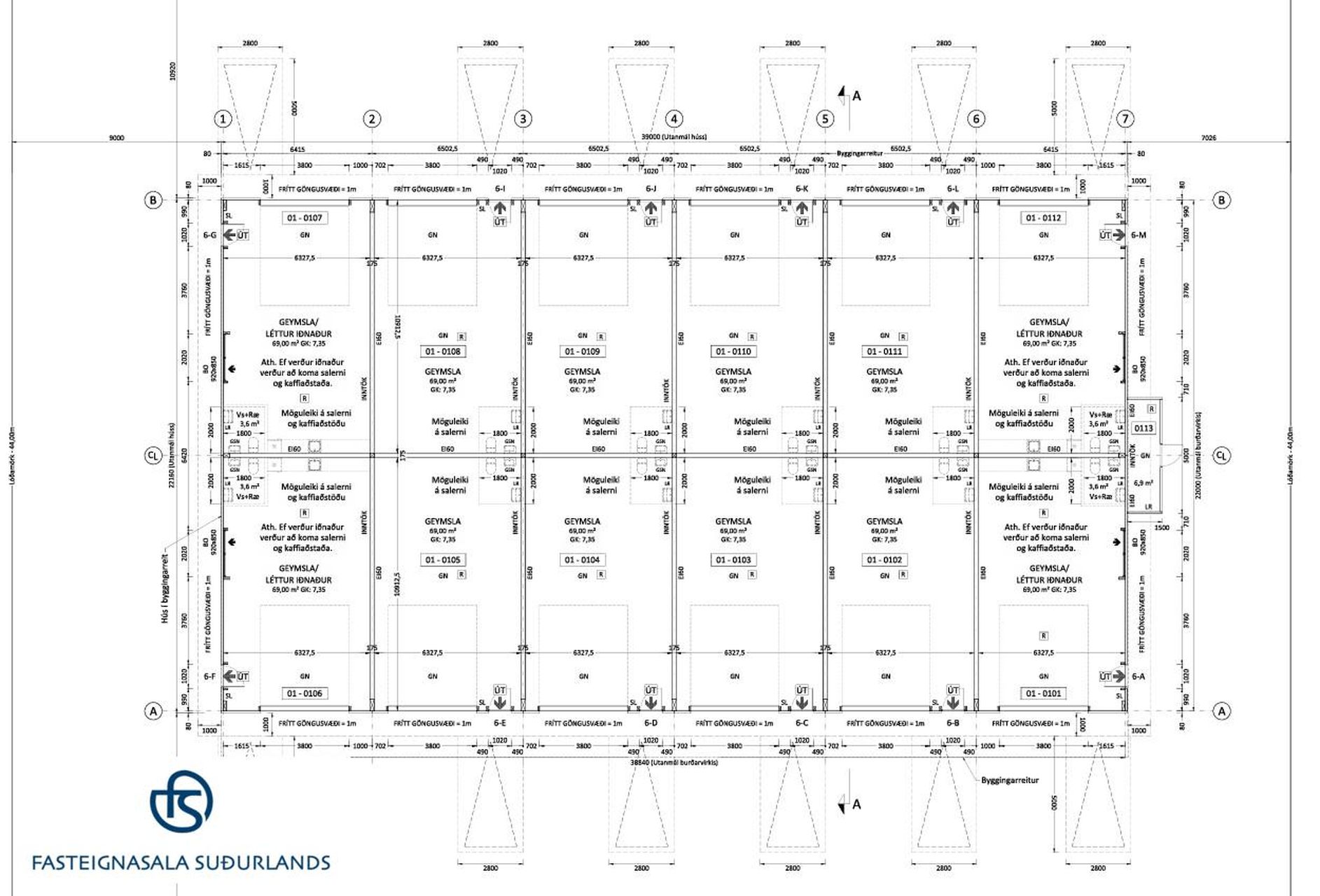 Rafmagn: Aðaltafla með mælum fyrir hverja starfseiningu frágengin í inntaksrými. 3ja fasa tengli við hliðina. Tenglar á nokkrum stöðum.