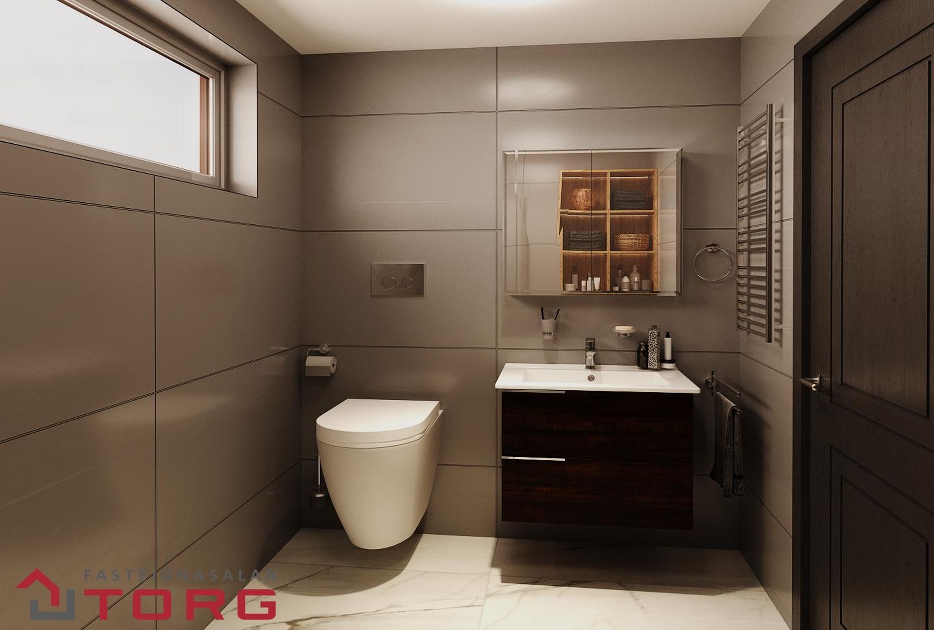 Baðherbergi er flísalagt í hólf og gólf. Öll salerni eru upphengd og innbyggð í vegg. Sturta er í öllum íbúðum og sturtubotn flísalagður.
