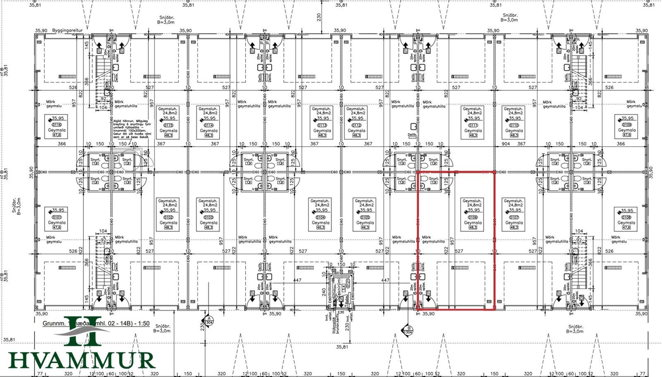 Milliveggir: Allir léttir innveggir (kringum snyrtingu) eru gerðir úr 100mm samlokueiningum. Milliveggir milli rýmisnúmera eru 100mm samlokueiningar með harðpressaðri steinull og eru þær samkv. EI60.