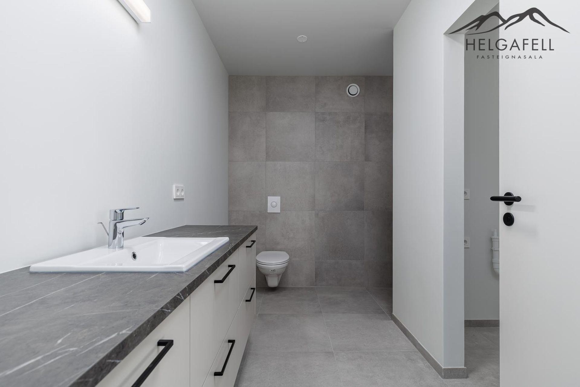 Baðherbergi: Rúmgott og flísalagt í hólf og gólf (flísar frá Agli Árnasyni), upphengt salerni, "Walk-in" sturta. Inn af baðherbergi er flísalagt þvottahús.