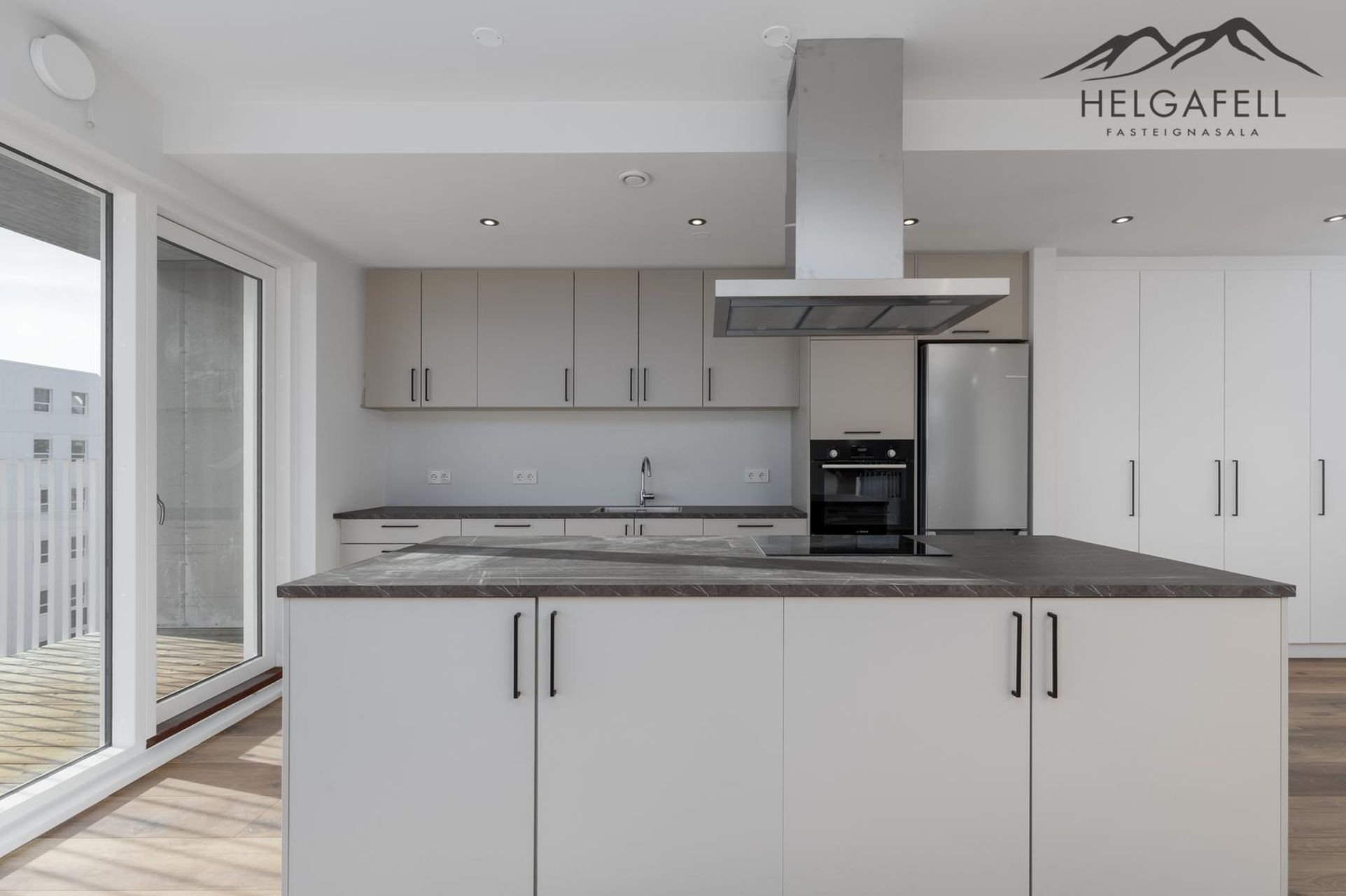 Eldhús er opið við stofu í L, með stórri eyju sem snýr að borðstofunni. Öll eldhústæki fylgja með, Bosch ísskápur, uppþvottavél, helluborð, gufugleypir og bakaraofn í vinnuhæð. Öll tæki frá Smith&Norland.