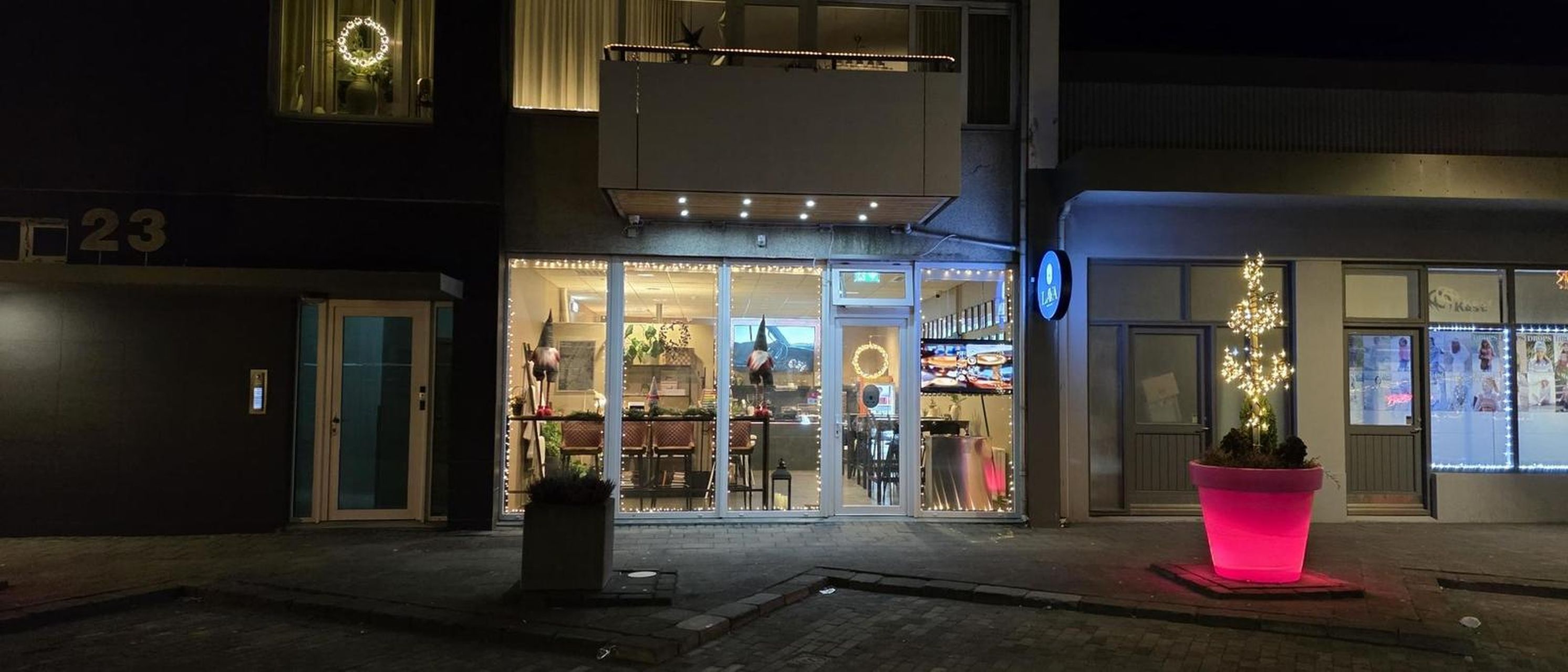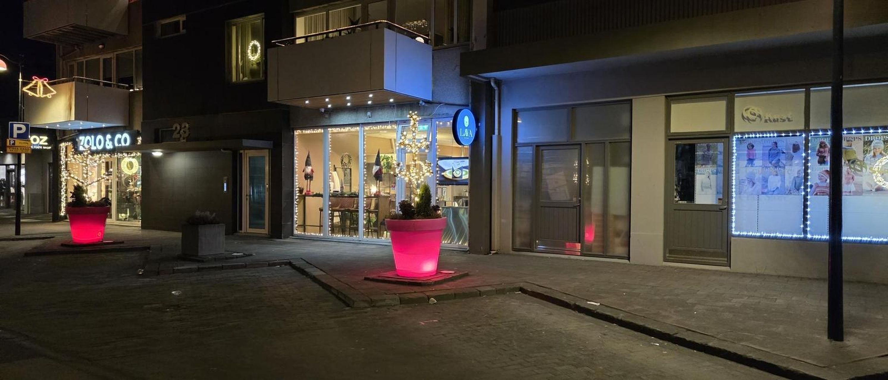 Á jarðhæð við Hafnargötu, eina af fjölförnustu götum bæjarins.