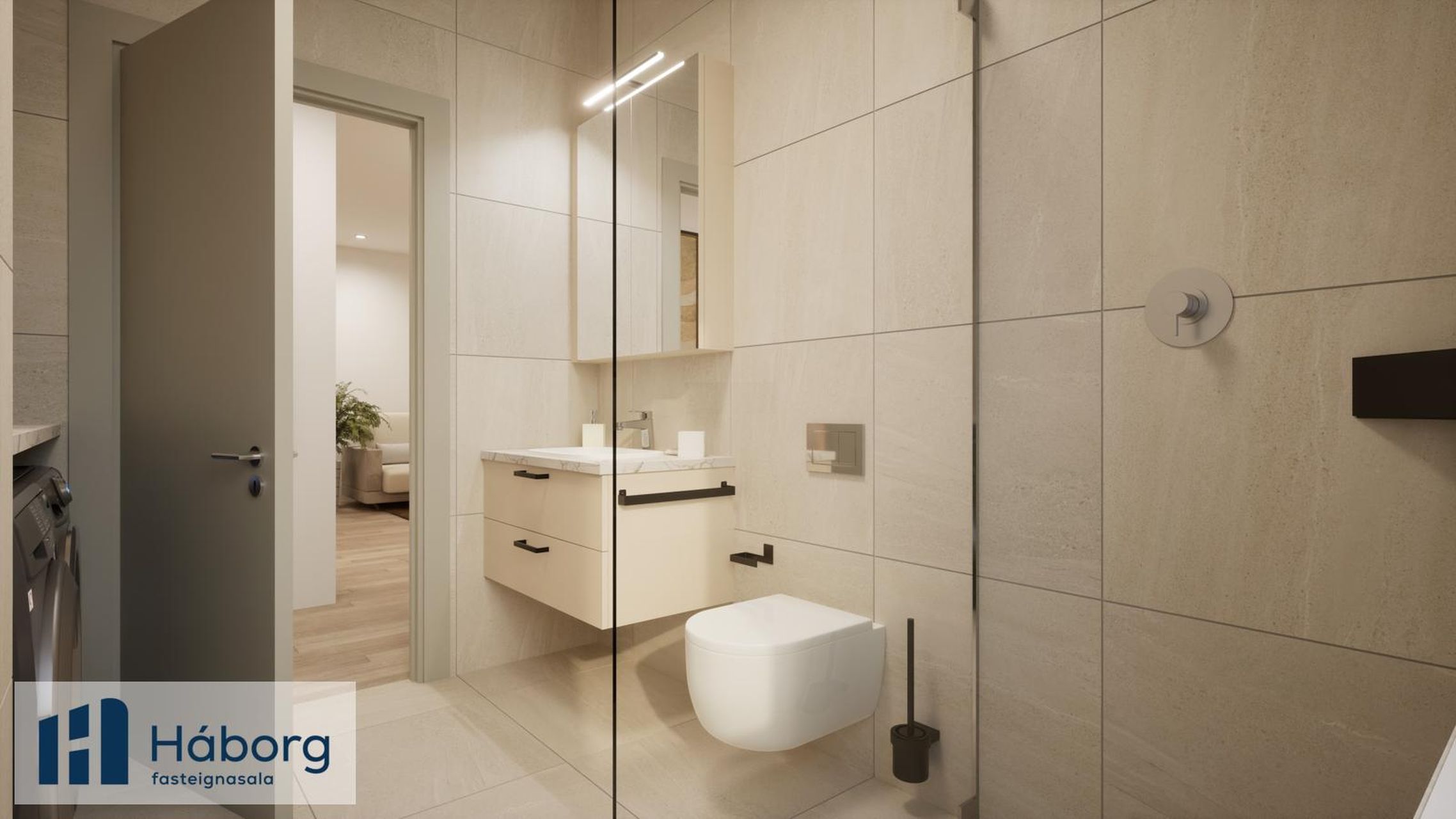 Nánari lýsing á íbúð 212 4ra herbergja: Stærð 123,9 fm. Sérinngangur af svölum. Þegar komið er í forstofu eru góðir fataskápar. Barnaherbergi tvö eru rúmgóð og björt með góðum fataskápum. Hjónaherbergi er einnig rúmgott og bjart með góðum fataskápum og með útgengi út á svalir. Baðherbergi er með góðri snyrtiaðstöðu. Sér þvottahús með góðri vinnuaðstöðu. Alrými er mjög rúmgott og bjart með opið eldhús. Stofur eru rúmgóðar og bjartar. Úr alrými og stofu er útgengt á svalir 6,5 fm að stærð. Eigninni fylgir stæði í bílakjallara merkt B24 og geymsla að stærð 8,3 fm.