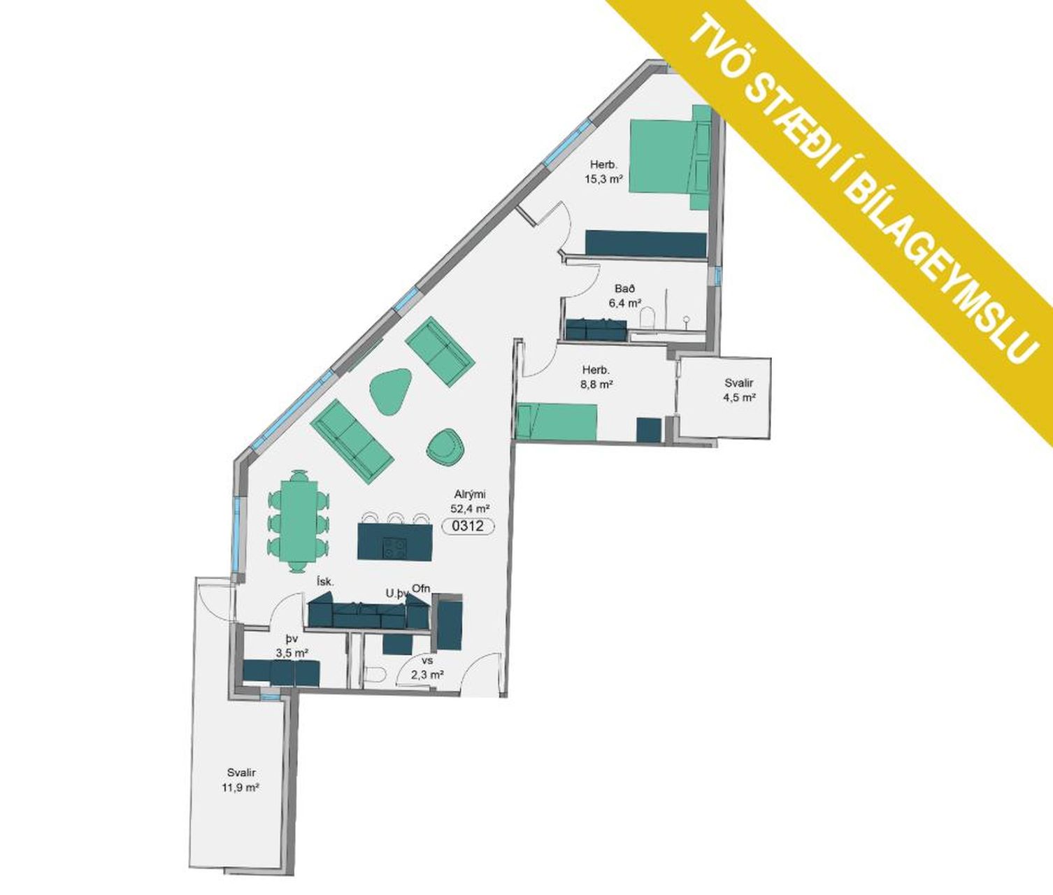 Íbúð 312 er 124,5 fermetra fjögurra herberegja íbúð á þriðju hæð. Steinn á borðplötum eldhúsa og loftskiptikerfi í íbúð. Eigninni fylgir frístundaskúr. Tvennar svalir og Tvö bílastæði í lokaðri bílageymslu.