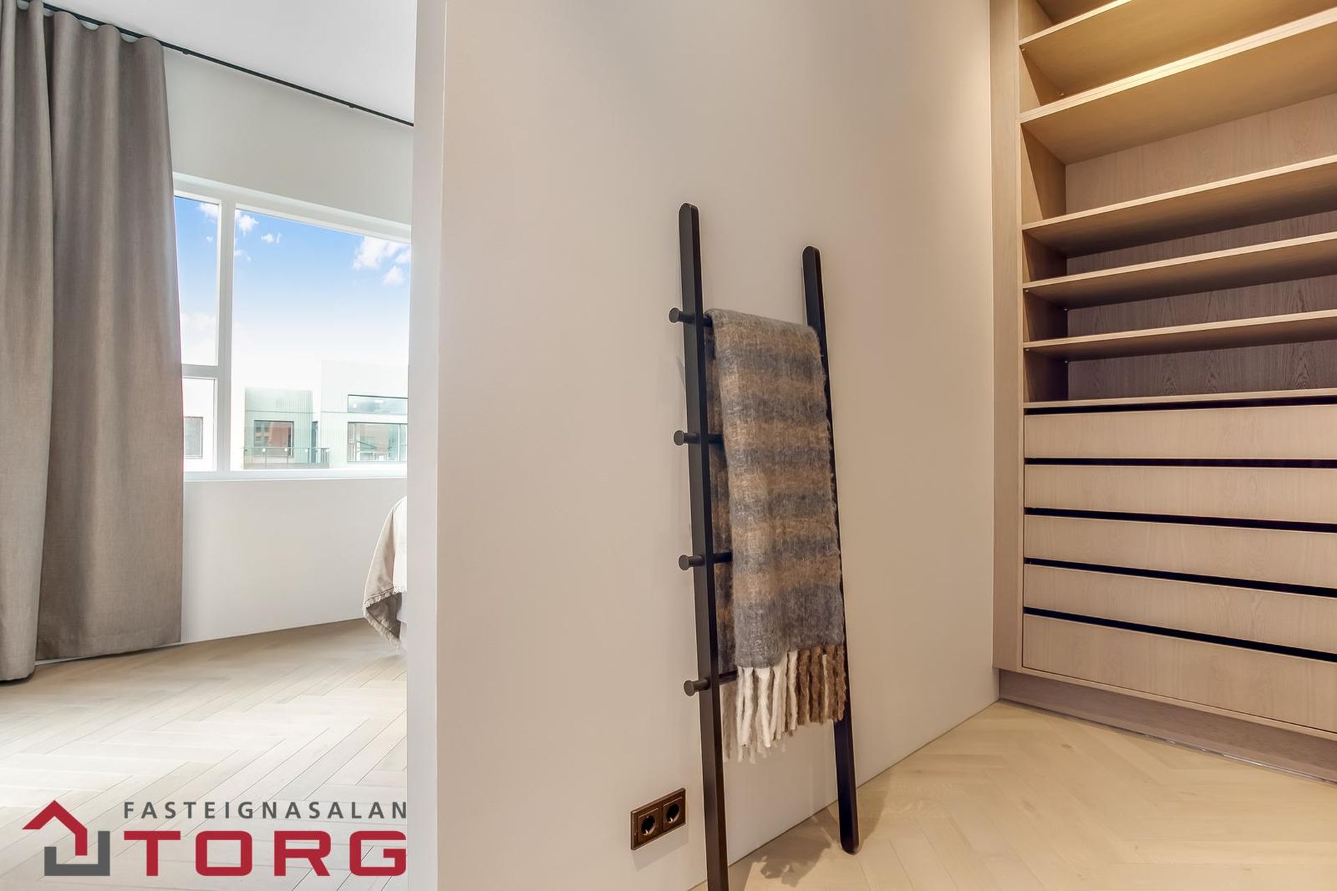 Kvarts steinn á borðplötum. Vönduð tæki eru í eldhúsi; innbyggður Siemens ísskápur, uppþvottavél. Gaggenau ofn og sambyggður ofn/örbylgjuofn (Combi ofn) í vinnuhæð, helluborð með innbyggðri viftu. Eldhús- og blöndunartæki að vandaðri gerð. Íbúðin skilast án gólfefna utan baðherbergja og þvottahús sem skilast flísalögð.