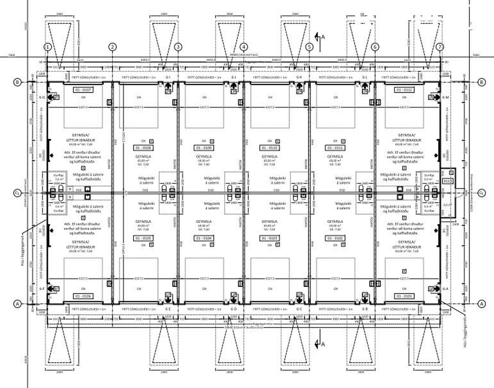 Nánari lýsing: Húsið er á einni hæð og skiptist í 12 einingar sem allar eru geymsla eða geymsla/léttur iðnaður, hver eining er 72m2 að birtu flatarmáli. Lóðin verður malbikuð, gert ráð fyrir einu bílastæði fyrir framan hverja starfseiningu.