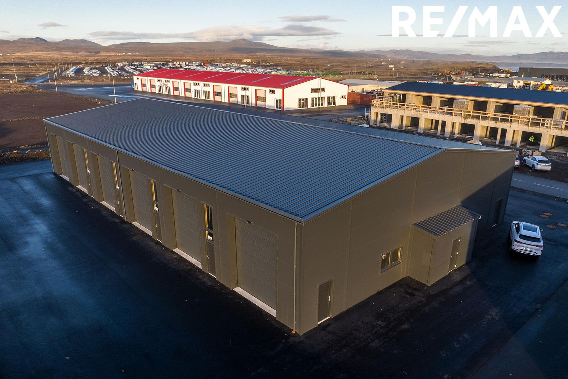 Gólfplata: Hefðbundin staðsteypt plata, einangruð að innan með gólfhita. Neysluvatnslagnir eru lagðar samkv. verkfræðiteikningum, rör í rör. Útveggir/ þak / þakkantur / burðarvirki: Allir útveggir og þak hússins eru úr yleiningum, samlokueiningar frá Kingspan. Burðarvirki er límtré. Litur klæðninga að utanverðu er RAL7016 og að innan RAL 9010. Þakkantur er einfaldur, stálklæddur í sama lit og þakefni með utanáliggjandi álrennum og niðurfallsrörum í sama lit. Mænishæð er yfir 7 metrar. Gluggar og hurðir: Iðnaðarhurðir eru frá Héðni og er hæðin 4,35, litur RAL 7016 og rafmótoropnun. Gönguhurðir og gluggar eru úr viðhaldsfríu PVC plasti með tvöföldu einangrunargleri. Litur RAL 7016. Frárennslis og neysluvatnslagnir: Skólp‐ og regnvatnslagnir eru fullfrágengnar og tengdar fráveitukerfi í götu. Gólfniðurfall er fyrir innan allar innkeyrsluhurðir. Deilikistur fyrir neysluvatn frágengnar í hverri starfseiningu. Niðurföll af malbikuðum plönum frágengin og tengd fráveitukerfi. Hitakerfi: Gólfhitakerfi sem er innsteypt í botnplötuna á járnagrind komið í hverja starfseiningu, deilikista með hringrásarkerfi tengd í hverri einingu. Kerfi stjórnað með handvirkum ofnloka. Slökkvitæki fylgir. Sér frádráttamælir fylgir hverju bili og er staðsett í inntaksrými. Rafmagn: Aðaltafla með mælum fyrir hverja starfseiningu frágengin í inntaksrými. Greinatafla frágengin í hverri starfseiningu með einum þriggja fasa tengli við hliðina. Tenglar á nokkrum stöðum í hverri starfseiningu skv. grunnhönnun raflagnahönnuðar. Full lýsing (LED) í hverri starfseiningu skv. grunnhönnun raflagnahönnuðar sem uppfyllir viðkomandi reglur. Raflagnir lagðar í aðgengilegum kapalstigum, auðvelt að breyta ljósum, slökkvurum, tenglum og slíku ef þurfa þykir. Útiljós við hurðir á hverri starfseiningu sem hægt er að stjórna frá viðkomandi einingu og tengist viðkomandi mæli (ekki sameign). Lóð: Afhendist malbikuð. Virðisaukakvöð hvílir á húsinu. Skipulagsgjald: Kaupandi greiðir skipulagsgjald þegar það verður lagt á sem er 0,3% af væntanlegu brunabótamati.
