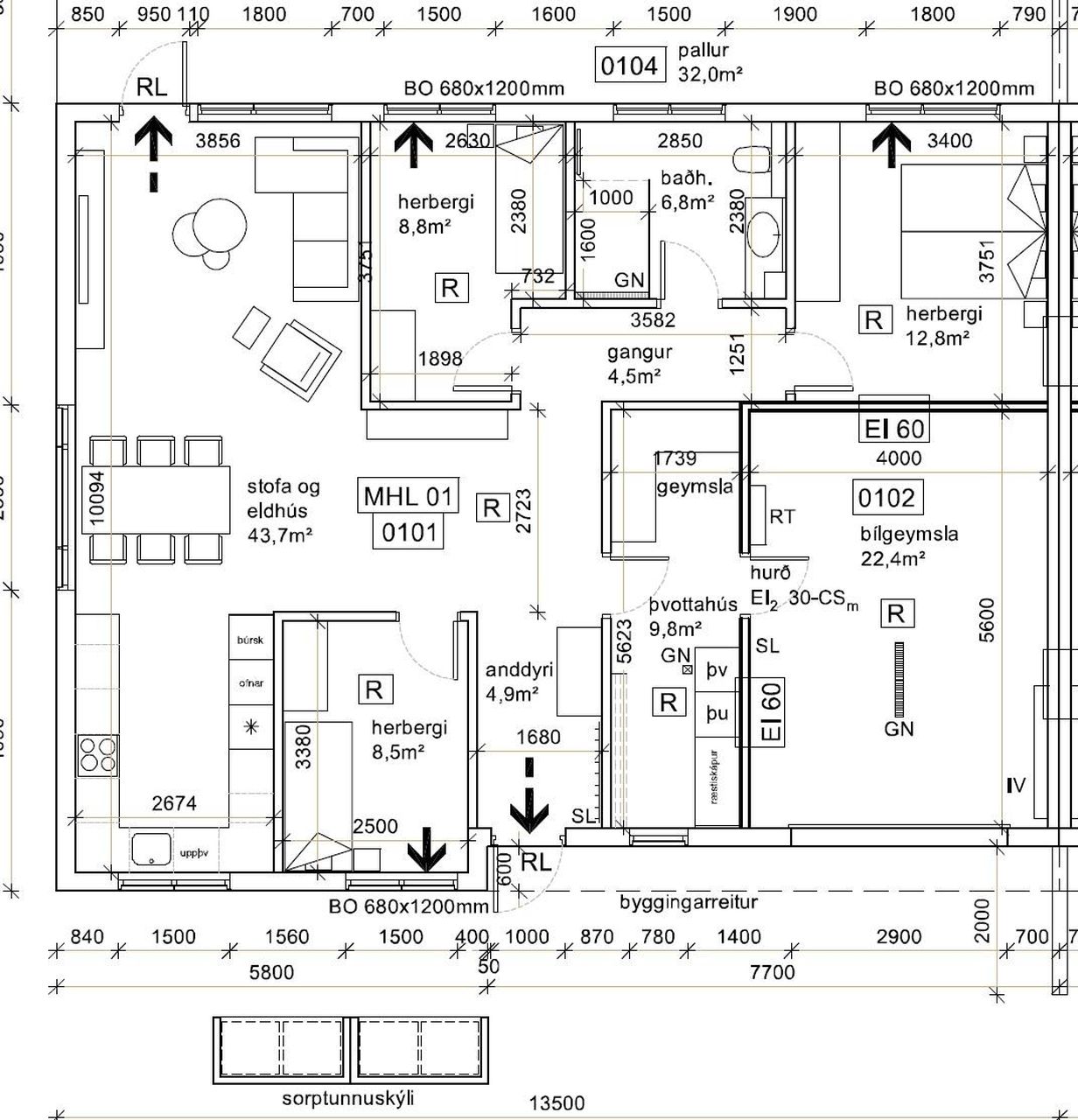 Úr forstofu er gengið inn í alrými sem er samliggjandi stofa og eldhús. Á svefnherbergisgangi eru 2 svefnherbergi og baðherbergi og gengið er inn í þriðja svefnherbergið frá alrými. Þvottahús og geymsla eru samliggjandi. Þaðan er innangengt er úr þvottahúsi í bílageymslu.