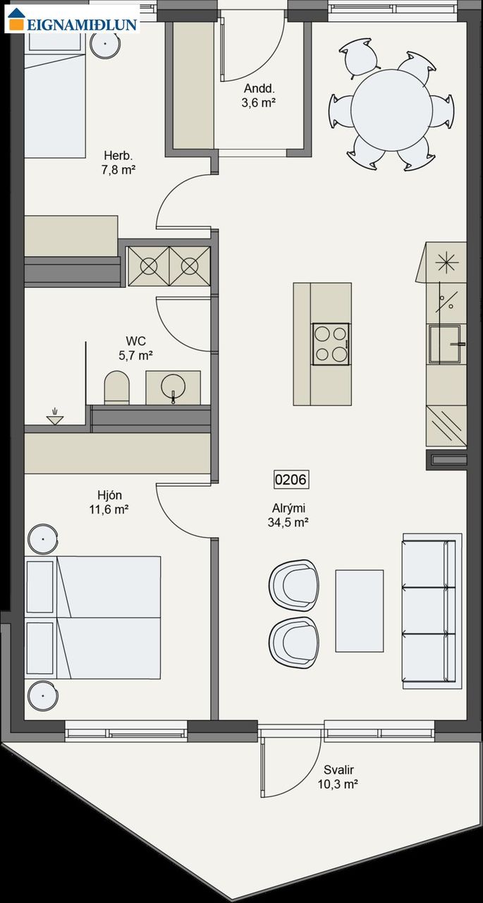 Íbúð 206 í Tryggvagötu 10, merkt 01-0206, er skráð samtals 82,6 fermetrar í fasteignaskráningu, sem skiptist í 73,4 fermetra íbúð og 9,2 fermetra geymslu í kjallara merkt 01-0001. Einnig fylgir bílastæði í bílakjallara merkt 05-B078HH. Fastanúmer eignarinnar er F253-5159. Íbúðin er skemmtilega hönnuð þriggja herbergja með stórri eldunareyju sem skiptir rúmgóðu alrými í tvennt með borðstofu öðru megin og setustofu hinu megin, þar sem er gengið út á skjólgóða verönd. Rými fyrir þvottavél og þurrkara inná baðherbergi.