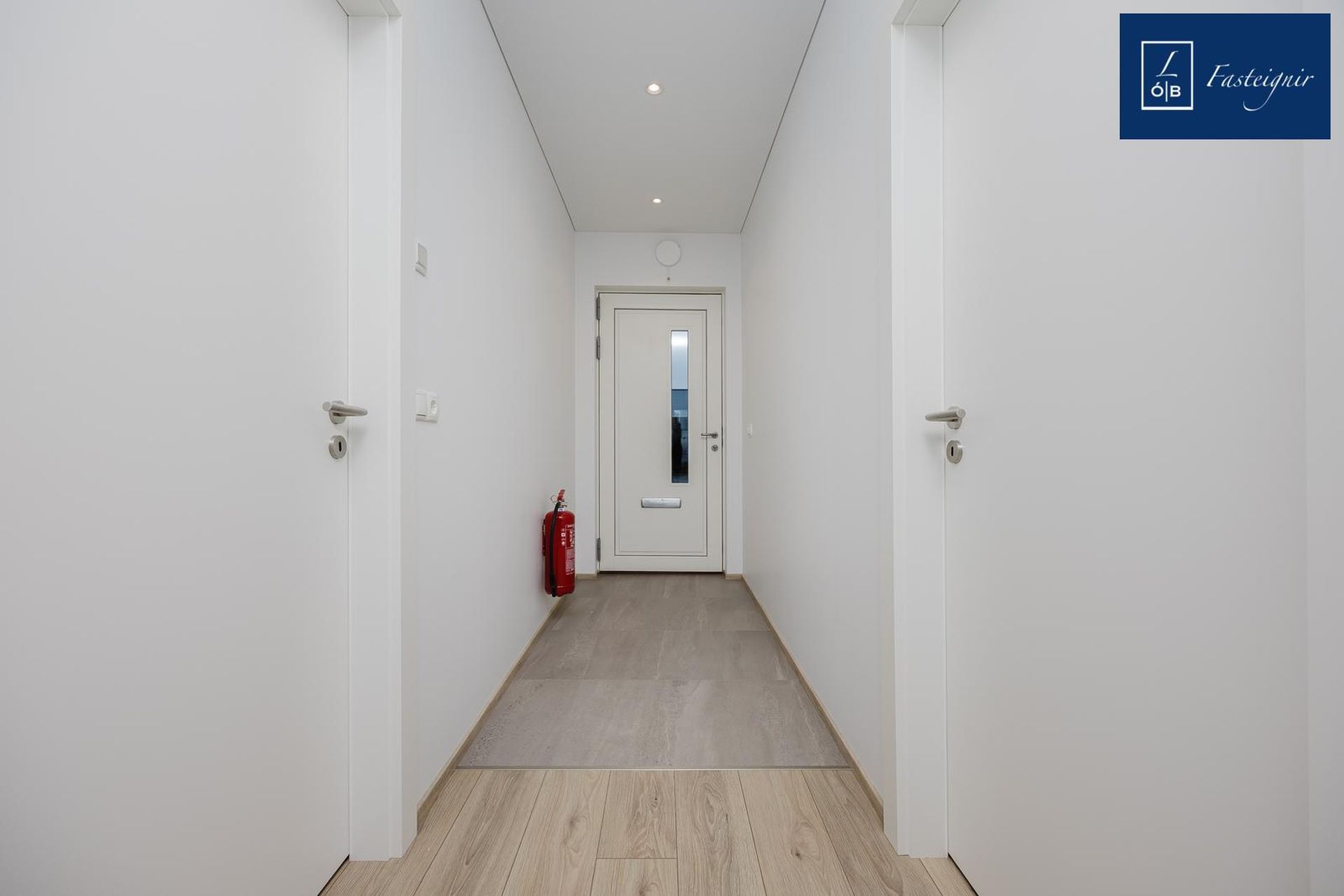 Að innan skiptist eignin í anddyri, 3 svefnherbergi, baðherbergi, þvottahús og eldhús og stofu í einu alrými. Útgegnt í garð úr stofunni. Fataskápar í svefnherbergjum og anddyri. Hljóðvistardúkur í lofti með innfelldri led lýsingu. Hiti í gólfi. Í eldhúsi er fullbúin eldhúsinnrétting frá Parka, með innbyggðum ísskáp, innbyggðri uppþvottavél, ofni og spanhelluborði á eldhúseyju. Gert ráð fyrir sætum fyrir 2-3 við eldhúseyjuna.