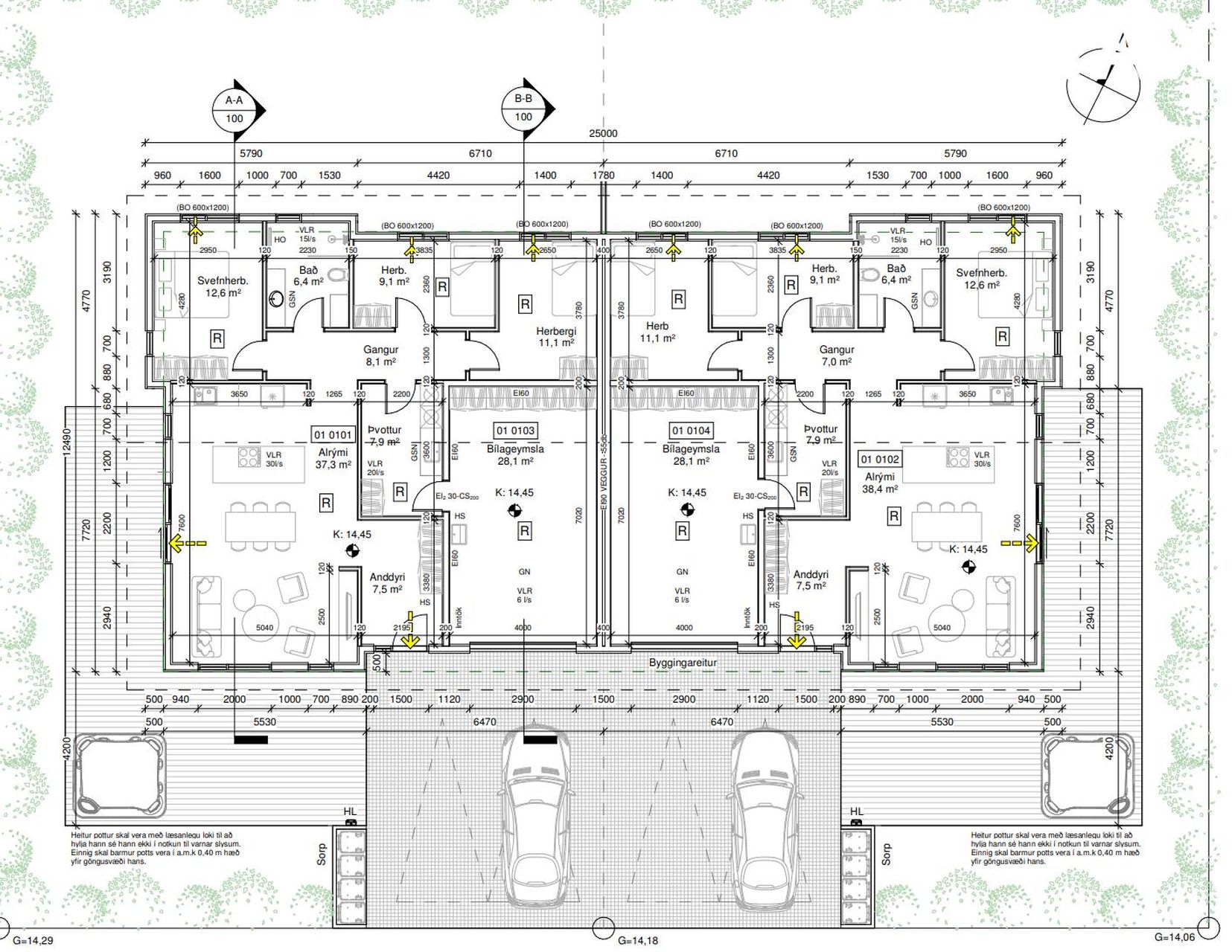 Húsin verða afhent tilbúin að utan, fokheld að innan samkvæmt skilalýsingu. Búið að setja mulning í planið á framan, steypt ruslatunnuskýli á framaverðu.
