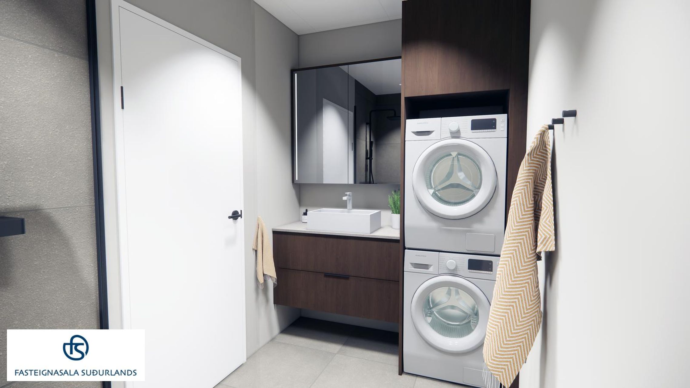 * Gert er ráð fyrir þvottavél og þurrkara (barkalausum) á baðherberginu á snyrtilegan hátt.