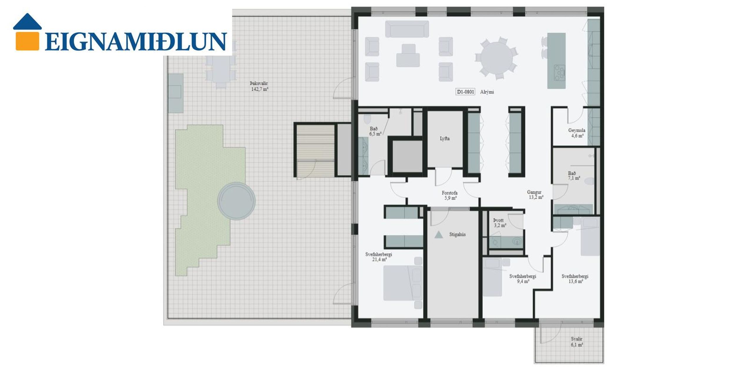 Orkureitur - Suðurlandsbraut 42B-801 , íbúð 08-01 er 5 herbergja, 225.9 fm íbúð. Íbúðinni fylgir bílskúr og sérmerkt bílastæði án endurgjalds í 10 ár.