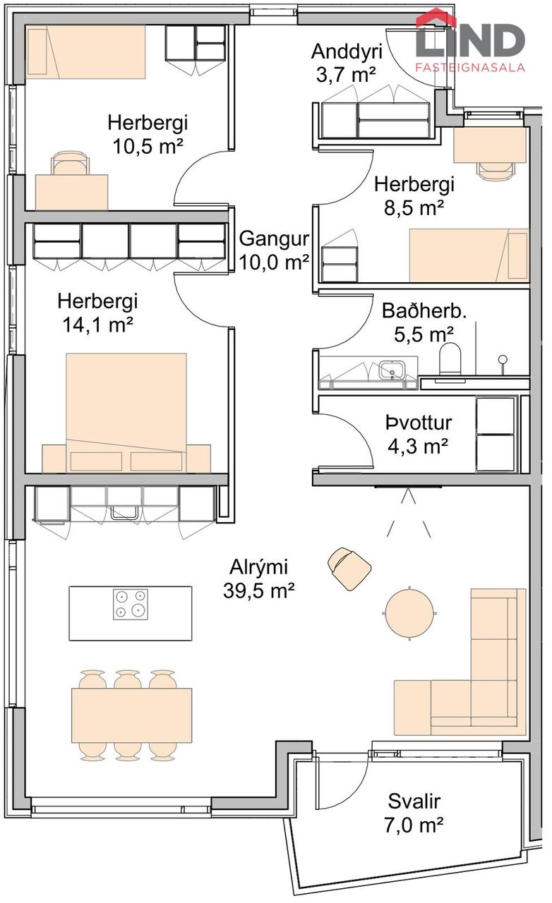Alrými: Parket á gólfi, útgengt út á svalir.