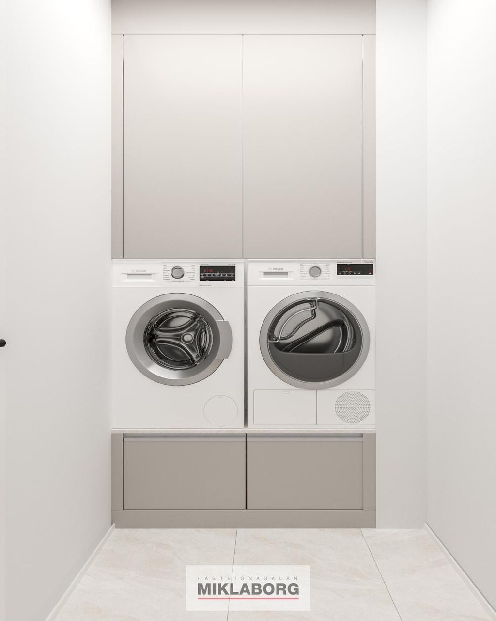 Þvottahús: Innan íbúðar með flísum á gólfum og upphengdum innréttingum.