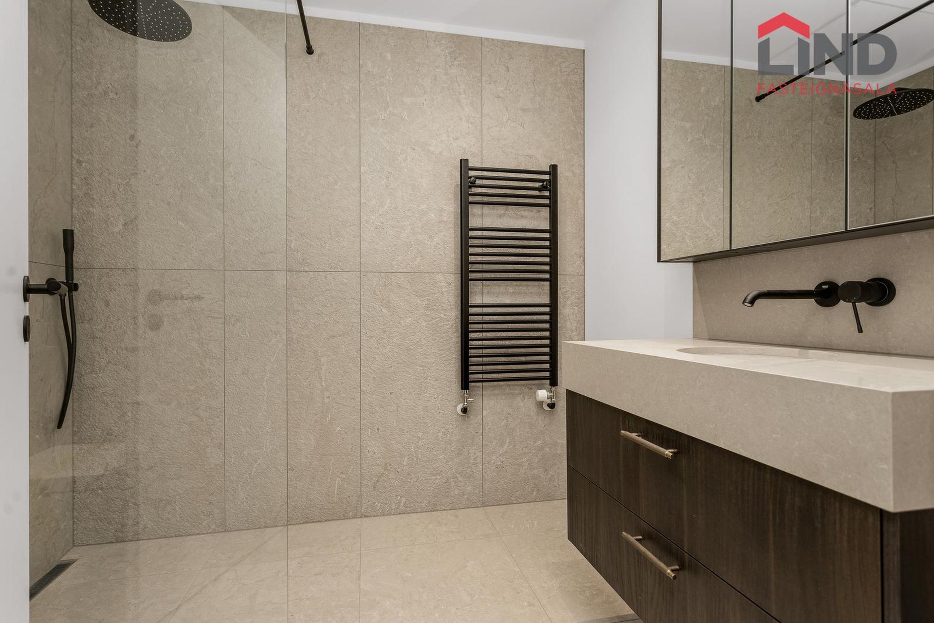Dekton Steinn á borðum, liturinn er innblásin af sandsteini og sameinar hlýja beige- og gráa tóna sem skapar rólegt og tímalaust yfirbragð. Vönduð tæki frá Miele og Elica. Vandaðar 60X120 flísar á baðherbergjum.