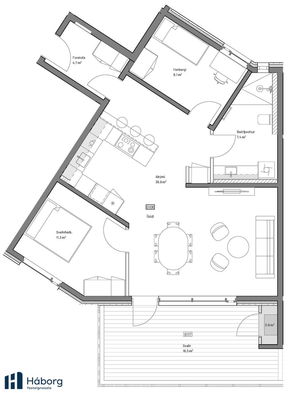 Íbúð 106 – 3ja herbergja íbúð á 1.hæð, staðsett í nýju og glæsilegu íbúðarhverfi. Að stærð 98,4 fm og þar af 13,7 fm geymsla, einnig fylgir eigninni stæði í bílakjallara. Íbúðin skipar forstofu, hol, hjónaherbergi, auka herbergi, baðherbergi með aðstöðu fyrir þvottavél/þurrkara og alrými opið með eldhúsi, borðstofu og stofu. Útgengt út á svalir úr stofu að stærð 18,7 fm.