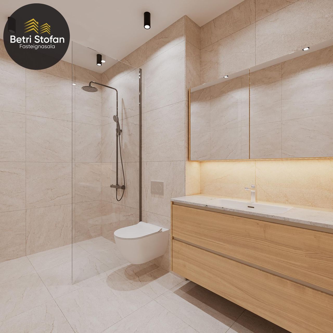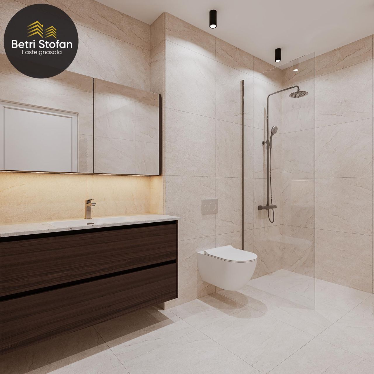 Hreinlætistæki: Salernisskál (Laufen) er vegghengd með innbyggðum vatnskassa. Sturtur eru með flísalögðum botni og hertu sturtugleri. Hreinlætistæki eru hitastýrð frá Damixa. Þvottahús eru ýmist innan baðherbergja eða í sér rými.
