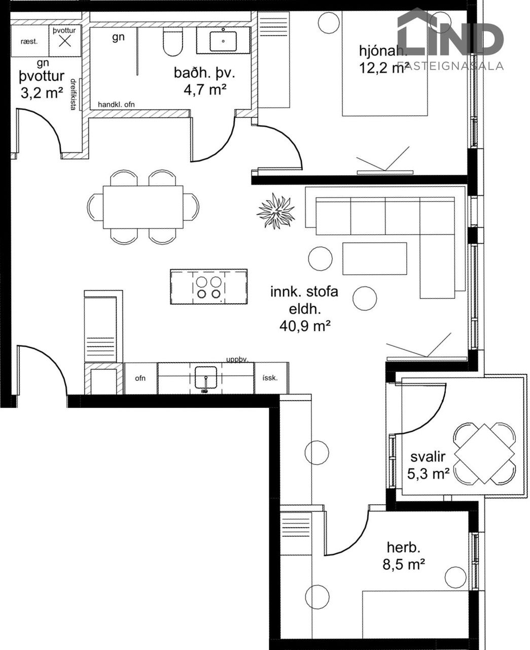 Stofa: Eldhús og stofa eru í opnu rými. Útgengi úr stofu á svalir.